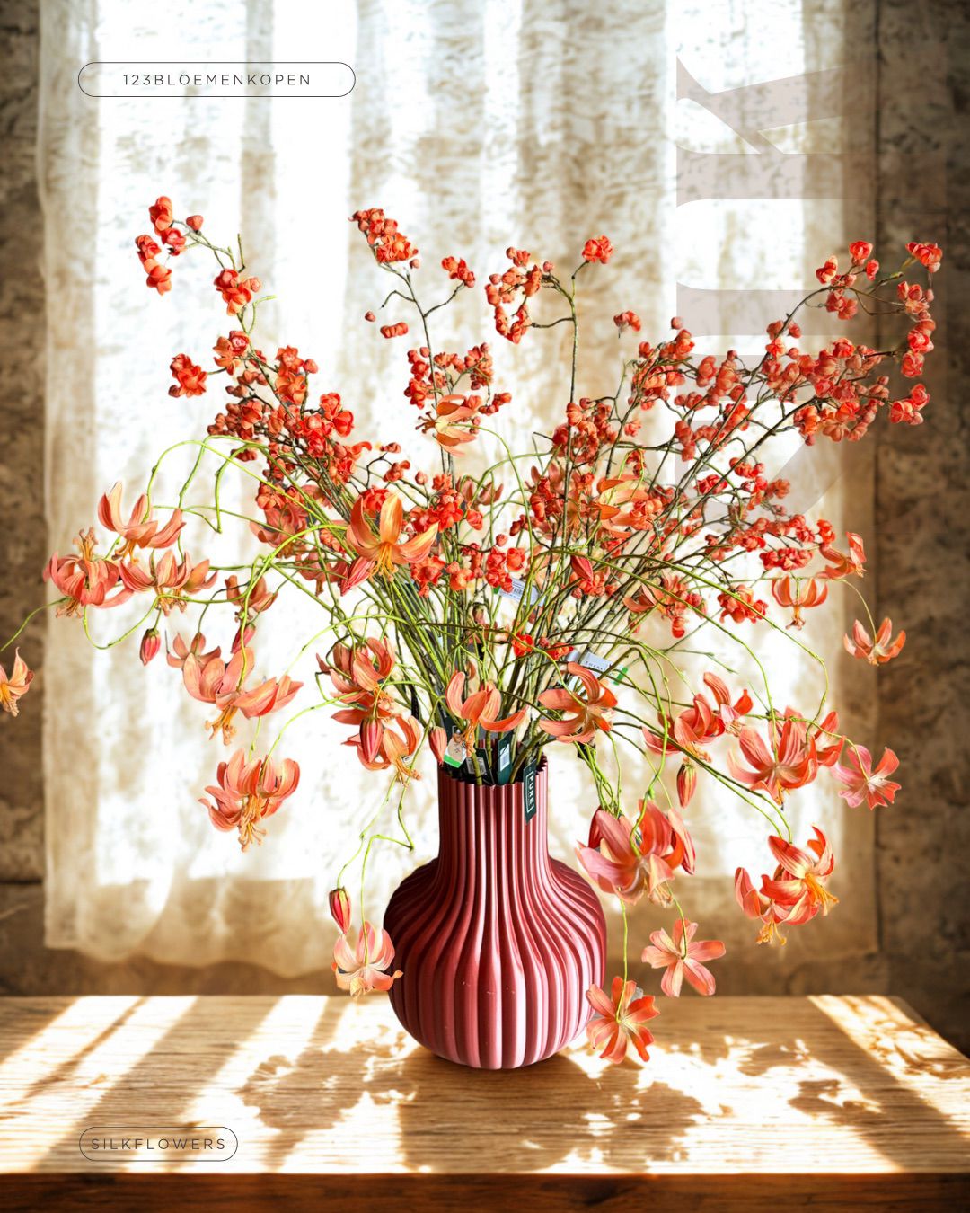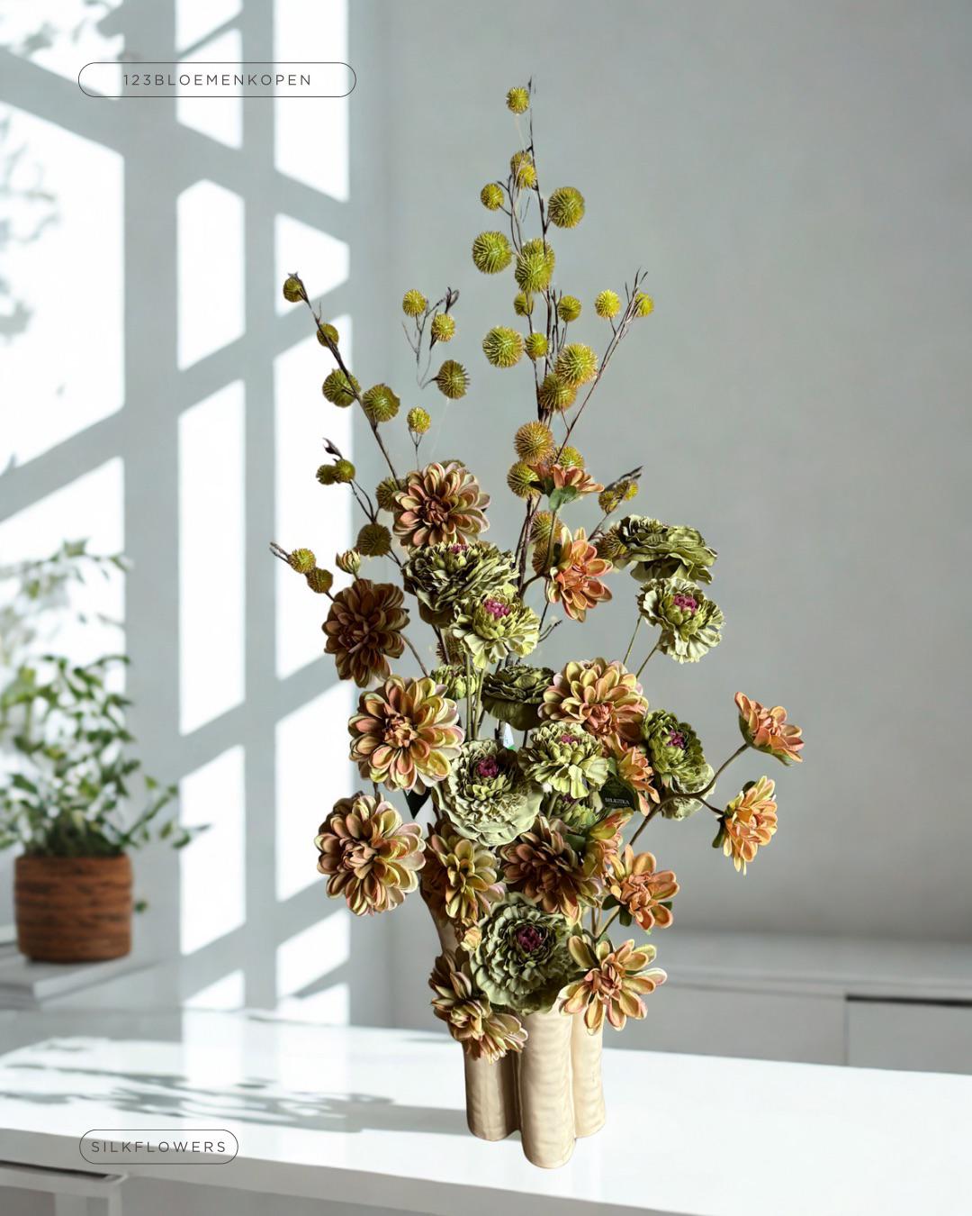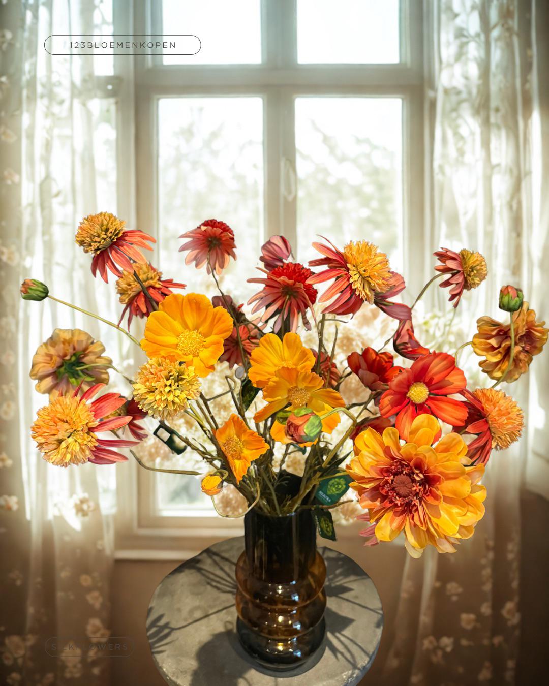 Bij 123bloemenkopen.nl leveren we alleen de allerbeste kwaliteit zijdebloemen en zijn niet meer van echt te onderscheiden. Tot in de details zijn ze uitgewerkt en ook voelen ze bijna echt. Onze bloemen worden zorgvuldig geselecteerd en door onze meesterbloemist omgetoverd tot unieke, stijlvolle boeketten. En zeg nou zelf: dit zijn geen gewone boeketten meer, maar échte floral design pieces – duurzame eyecatchers die je interieur laten stralen. Het voordeel? Ze hebben geen water nodig en blijven altijd mooi. En mis je de geur van de echte bloemen? Ook daar hebben we aan gedacht! Of je nu een boeket voor je bedrijf wilt huren middels onze abonnementen of een boeket wilt kopen of zelfs weg wilt geven als duurzaam cadeau. De hoogste kwaliteit, de mooiste details, de mooiste kleuren.