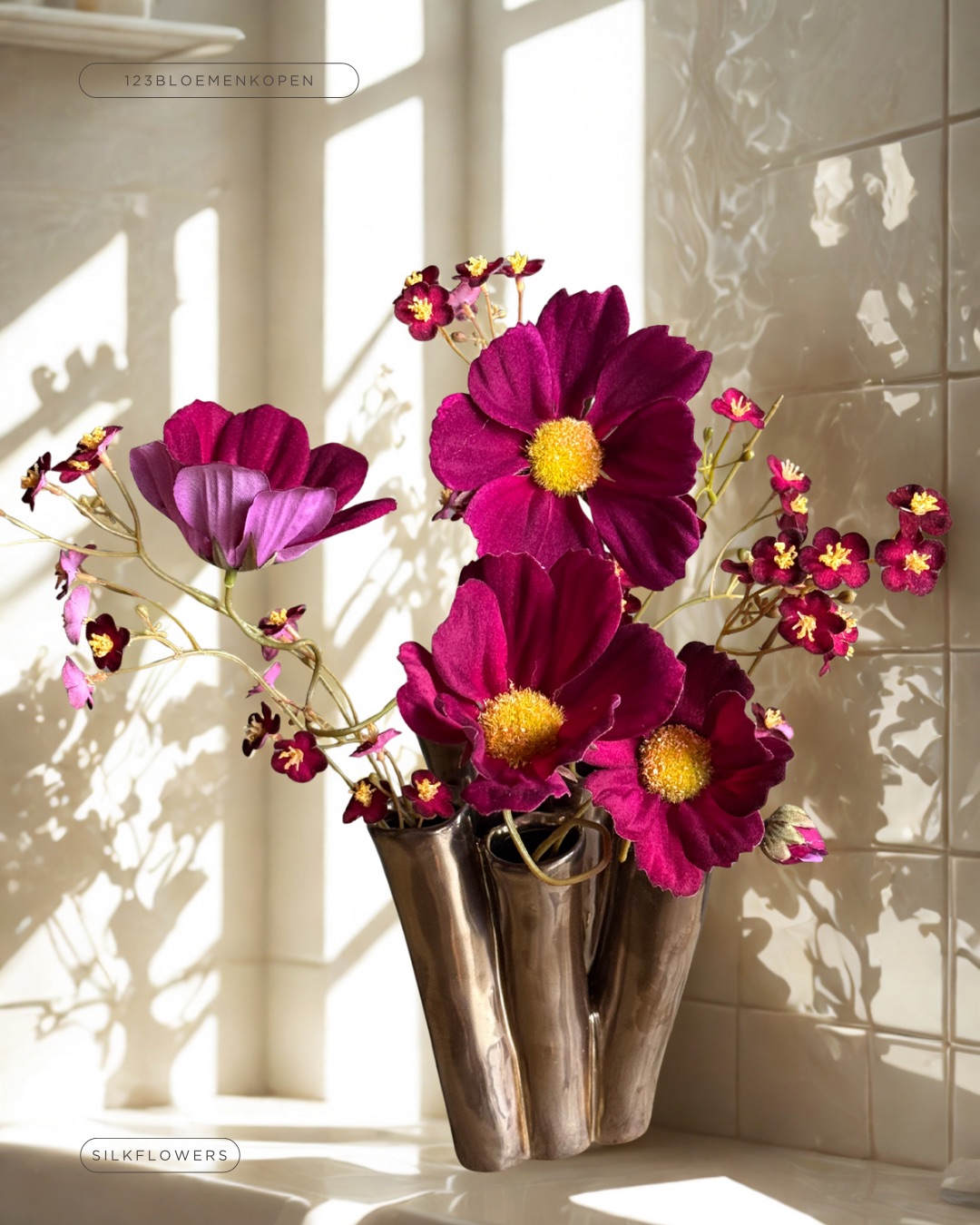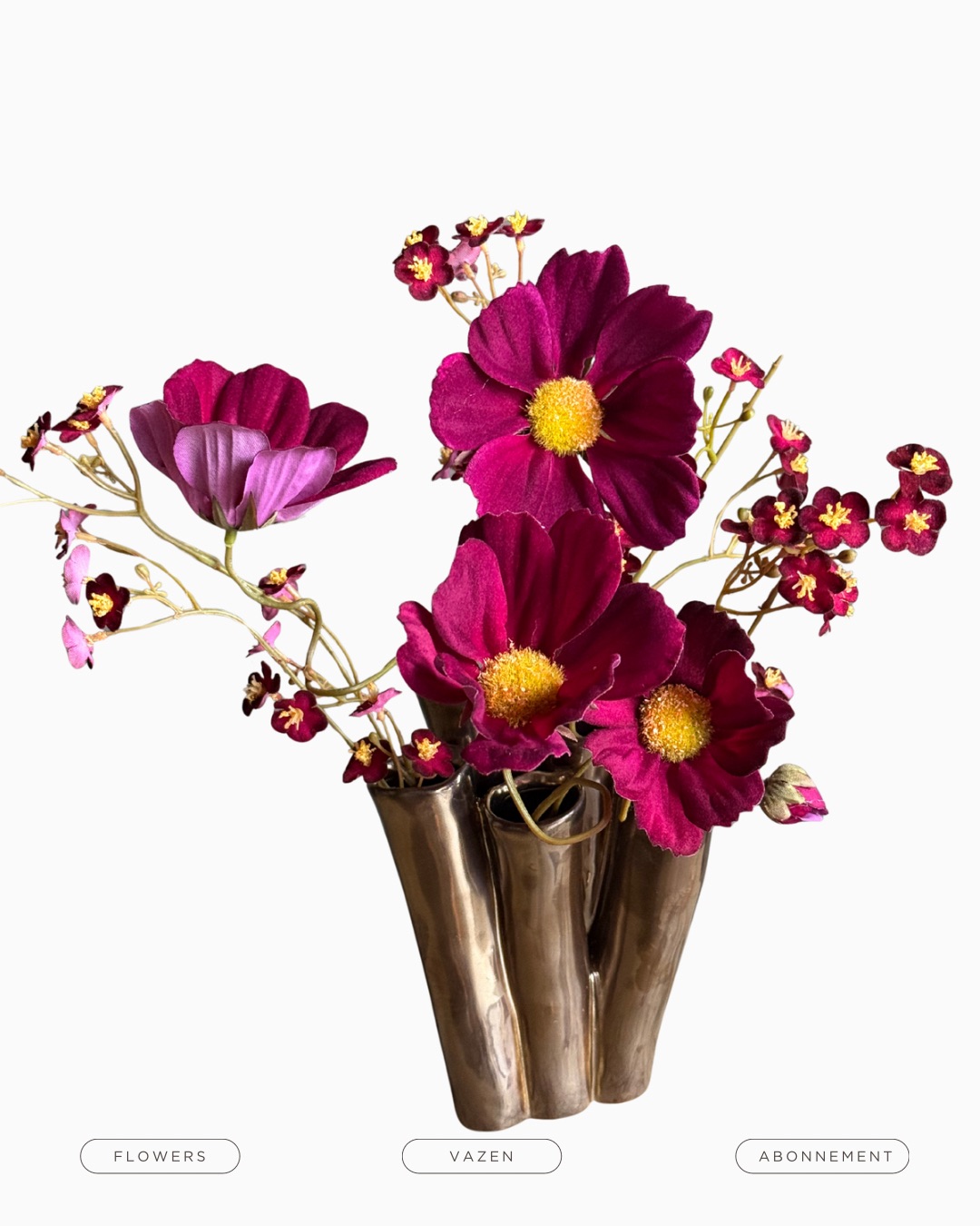 Wat is dit een geweldig leuk vaasje en die kleur is zo mooi. Het is geen zilver, het is geen goud… gewoon mooi. En het past bij ieder interieur. Hier gecombineerd met twee takjes Silkka bloemen. En je hebt een waanzinnig cadeau maar stiekem te leuk om weg te geven. Dus zoek een leuk hoekje in de keuken, badkamer of gewoon in de woonkamer. In twee maten en diverse kleuren