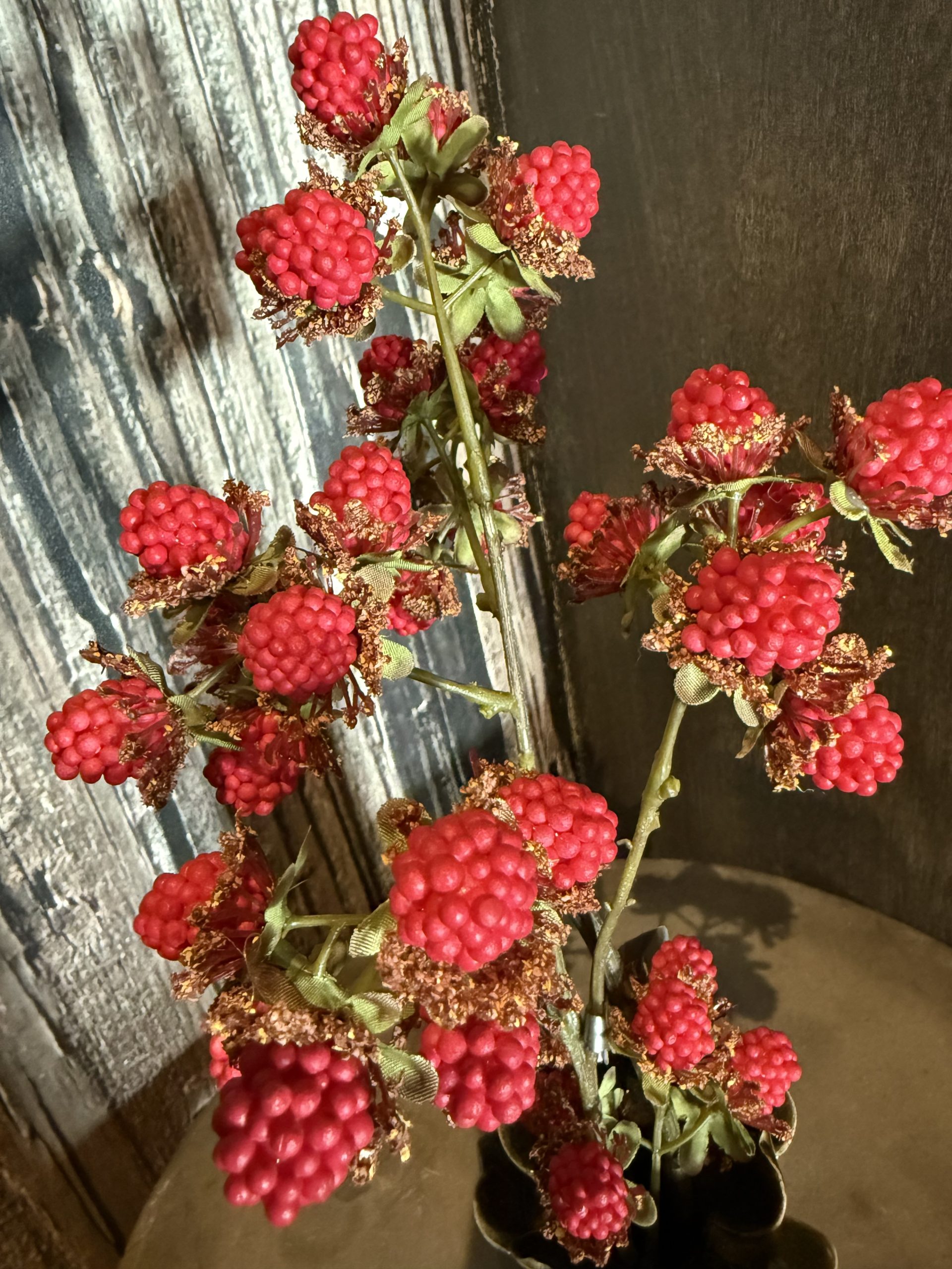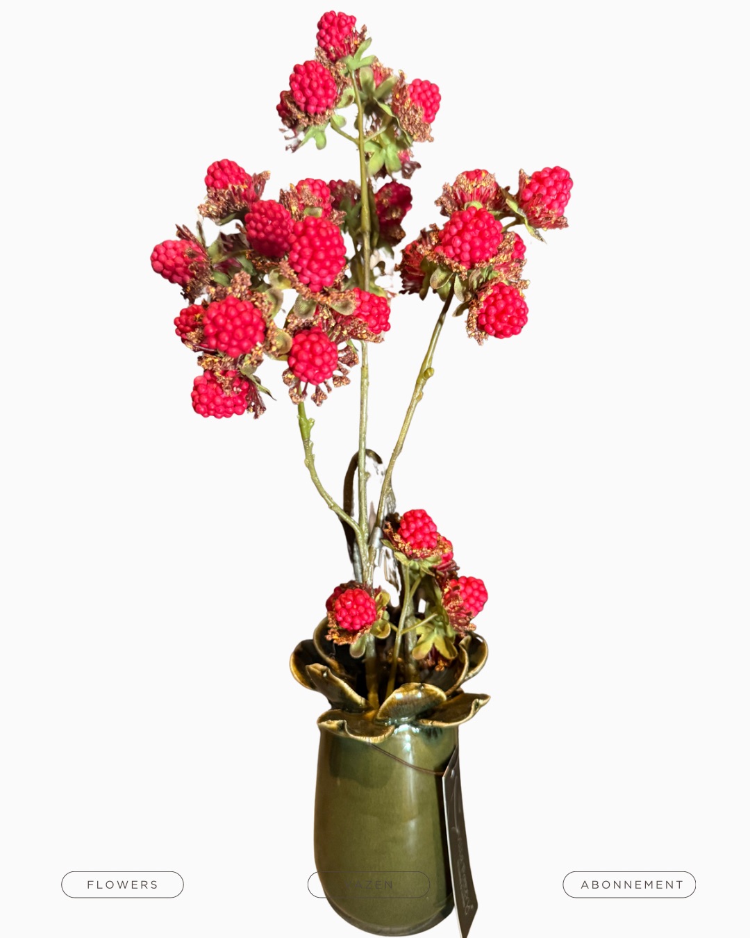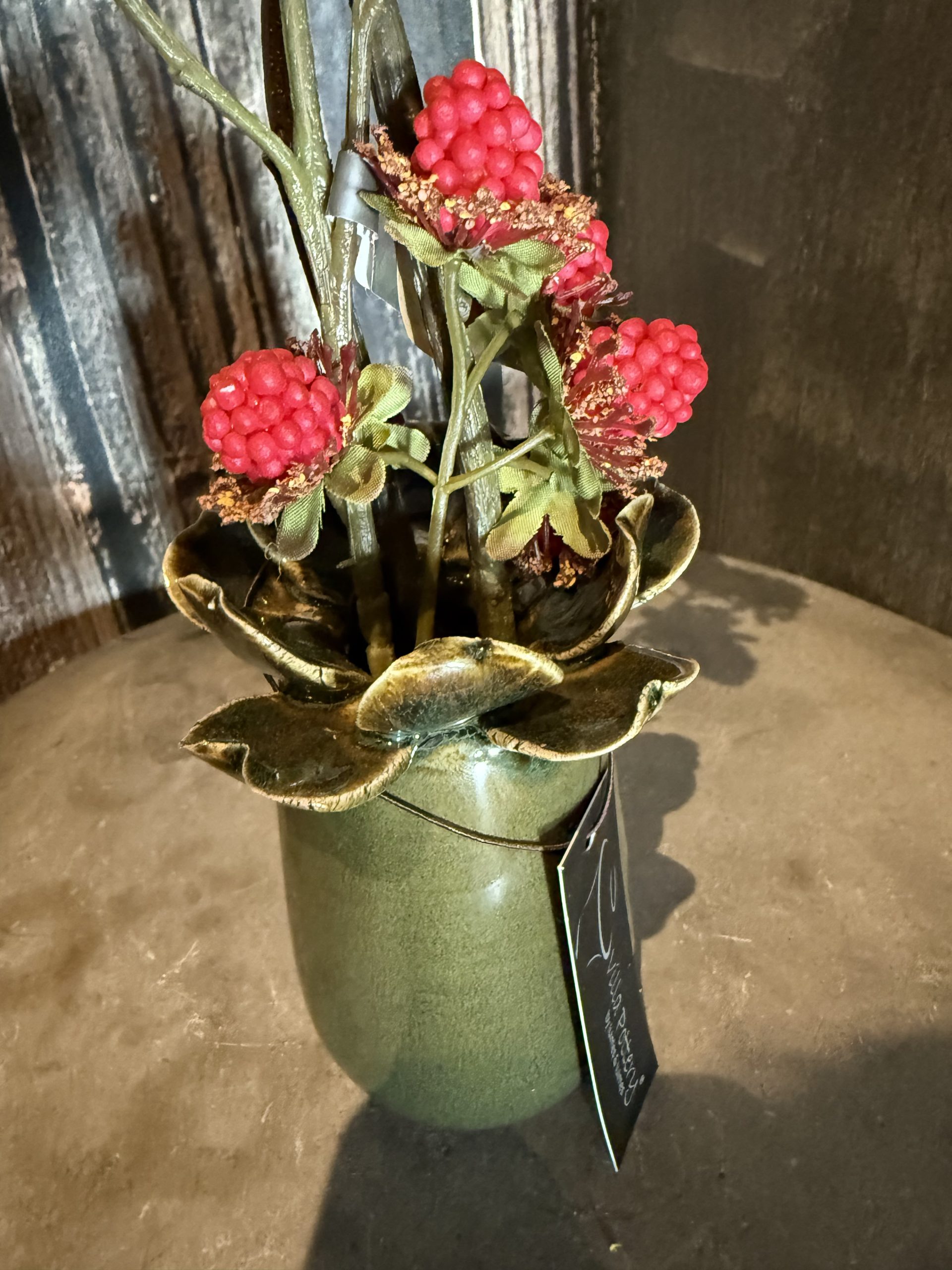 Hoe lief weer zo’n mini vaasje zo groot als je telefoon. Lekker in het landelijke donkergroen met een verrukkelijk lekkere tak met frambozen die tot in detail zijn uitgewerkt. Om te smullen…