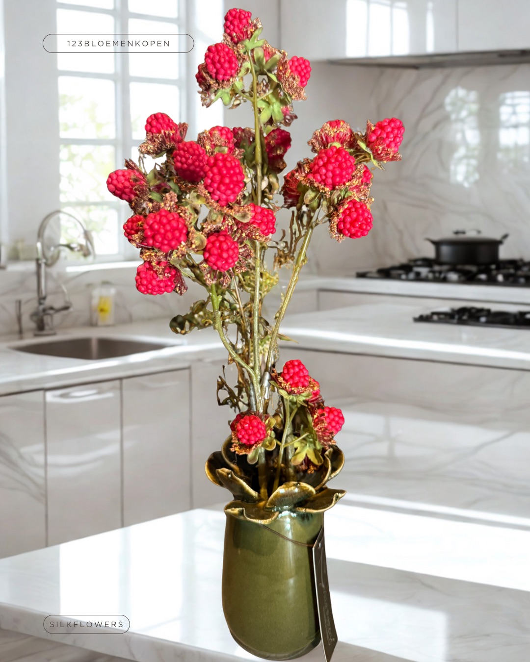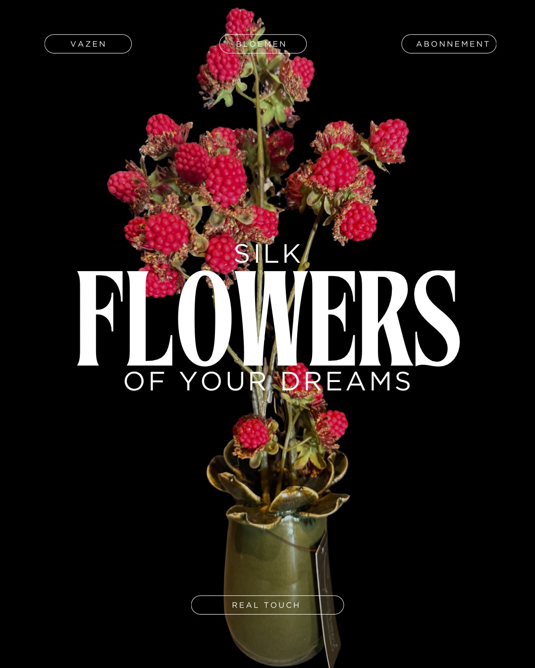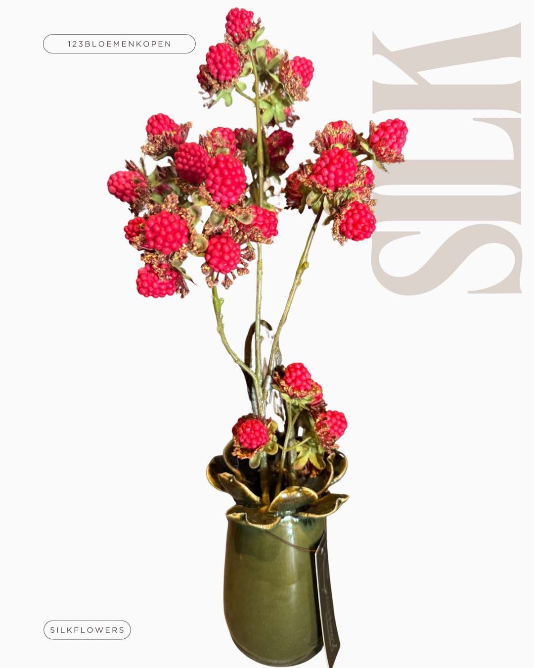 Hoe lief weer zo’n mini vaasje zo groot als je telefoon. Lekker in het landelijke donkergroen met een verrukkelijk lekkere tak met frambozen die tot in detail zijn uitgewerkt. Om te smullen…