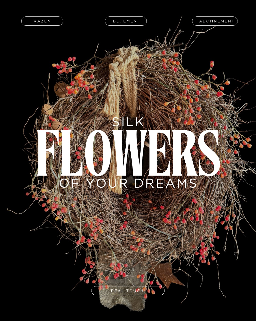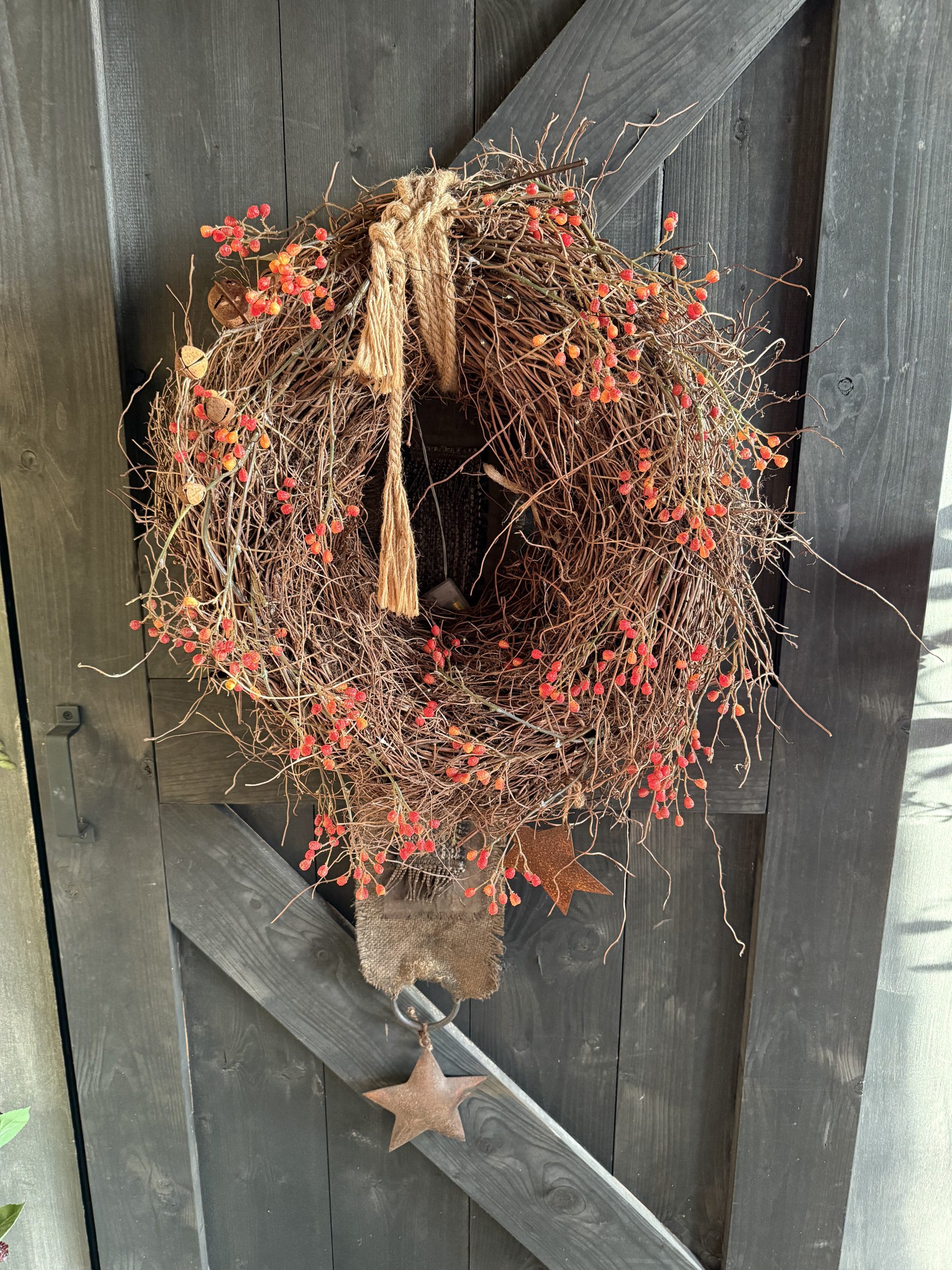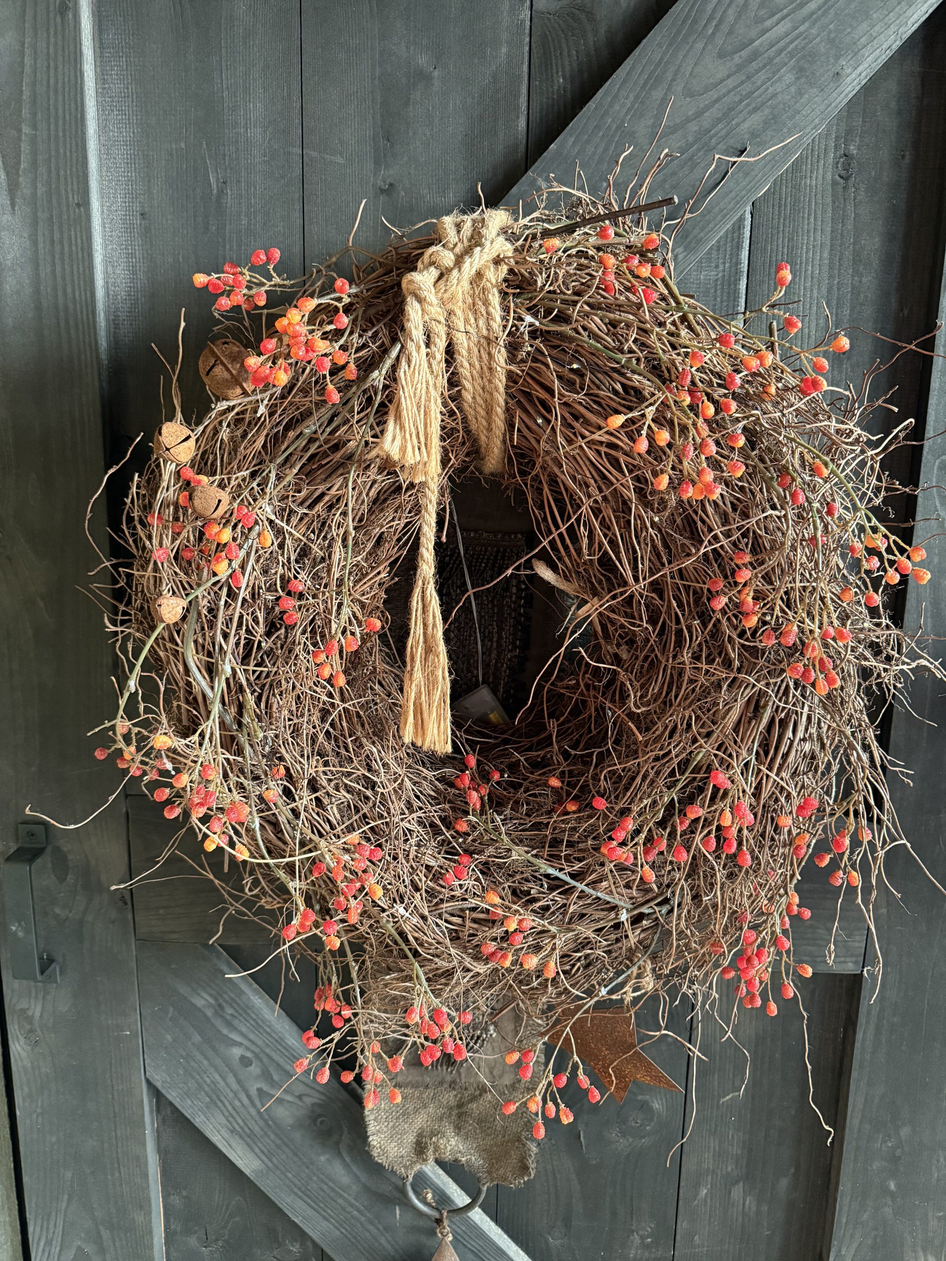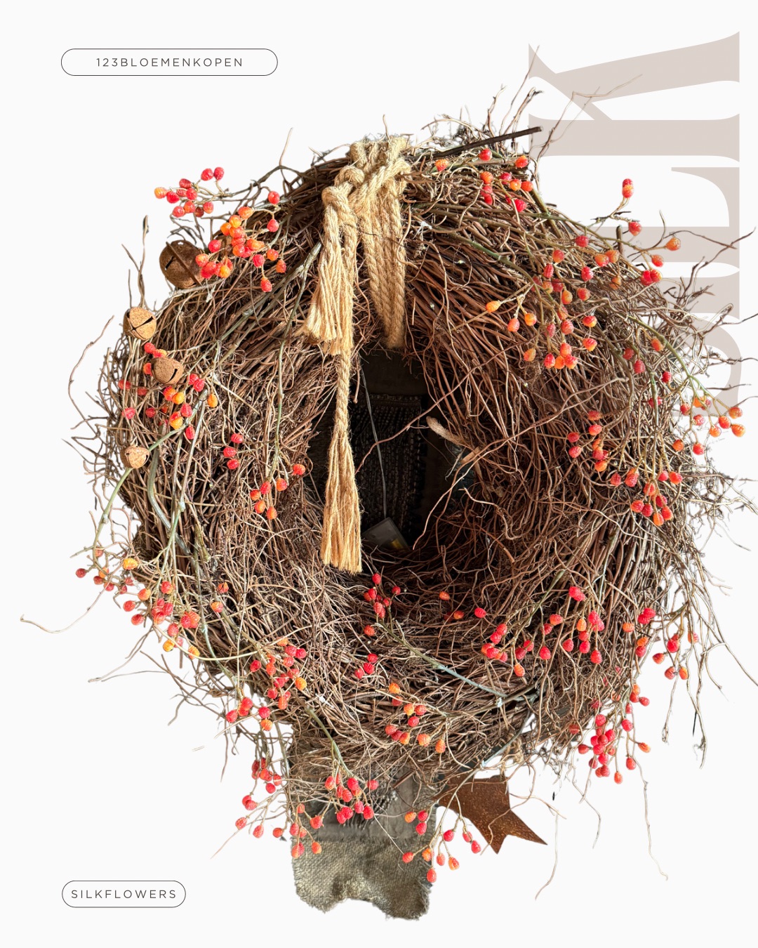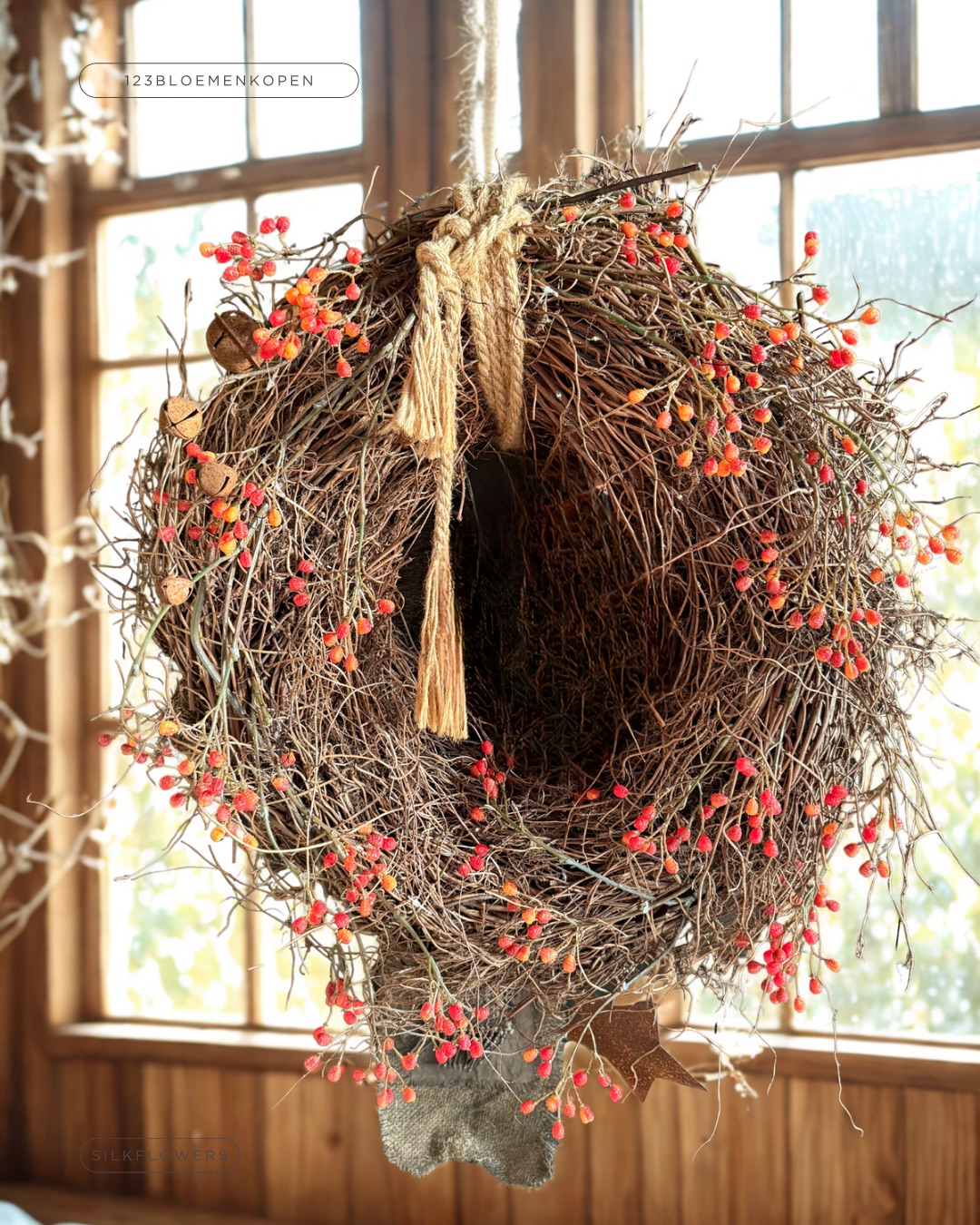 Ik houd er van… bijzondere bloemdecoraties als deze prachtige herfstkrans met kunst besjes en roest belletjes. Opgehangen aan een stoer dik koord