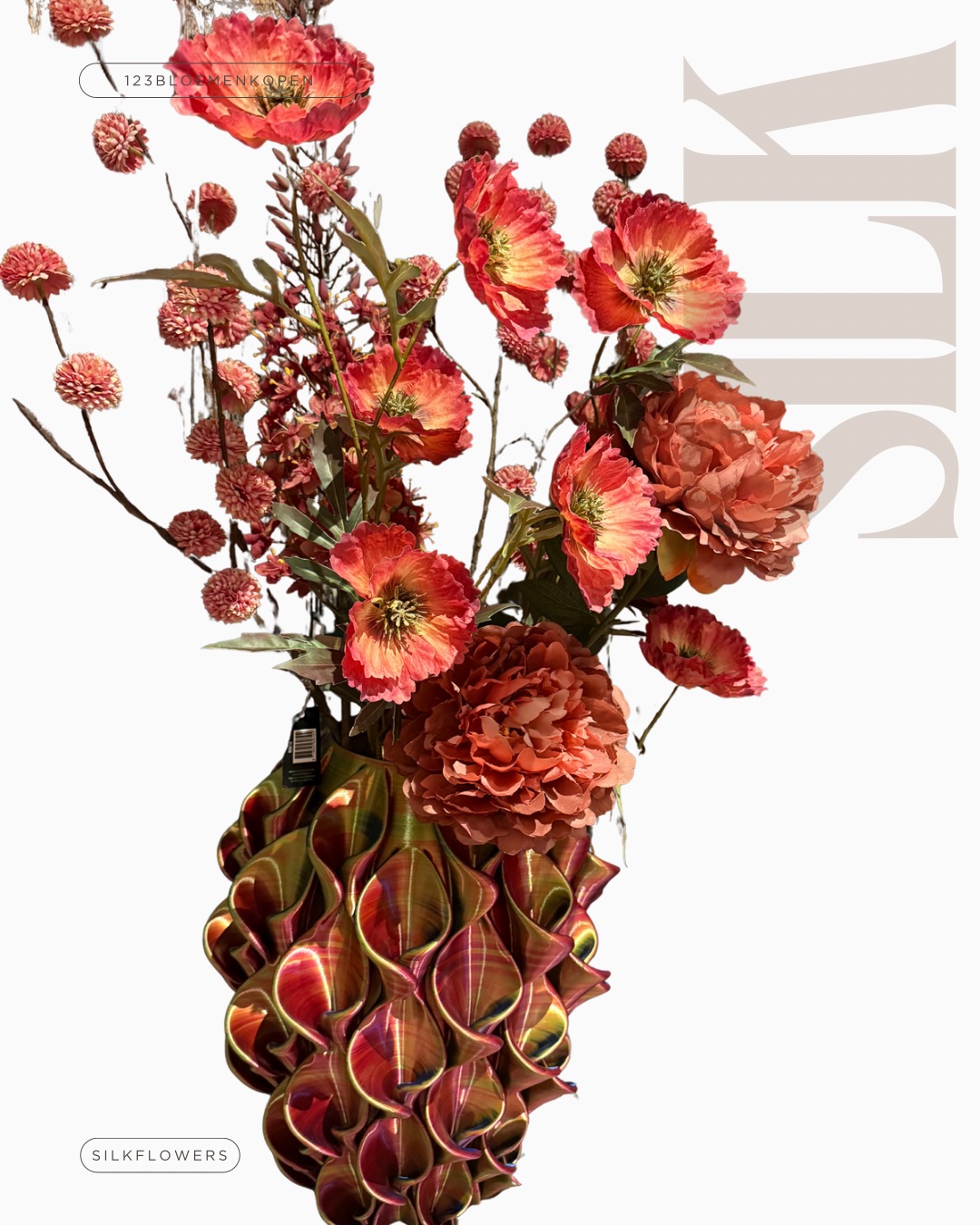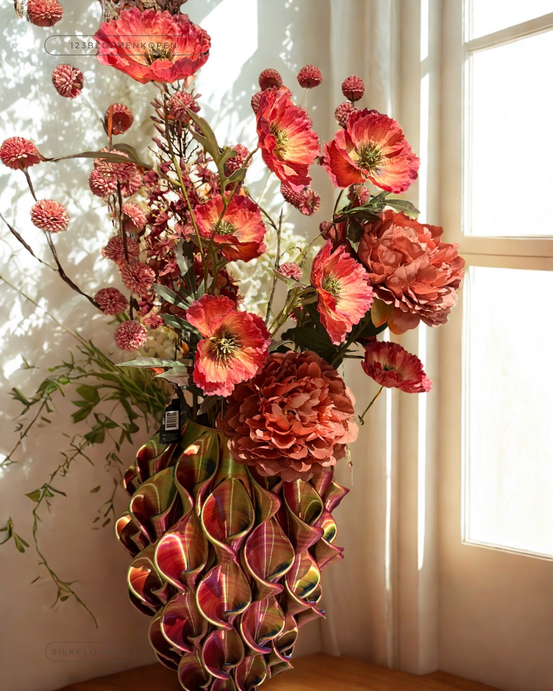 En dan gevuld met de prachtige rood roze Silkka herfst zijdenbloemen. Deze wil je gewoon in je huis.